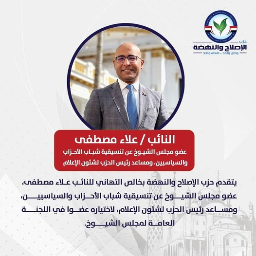 يتقدم حزب الإصلاح والنهضة بخالص التهاني للنائب علاء مصطفى، عضو مجلس الشيوخ عن تنسيقية شباب الأحزاب والسياسيين، ومساعد رئيس الحزب لشئون الإعلام، لاختياره عضوا في اللجنة العامة لمجلس الشيوخ.