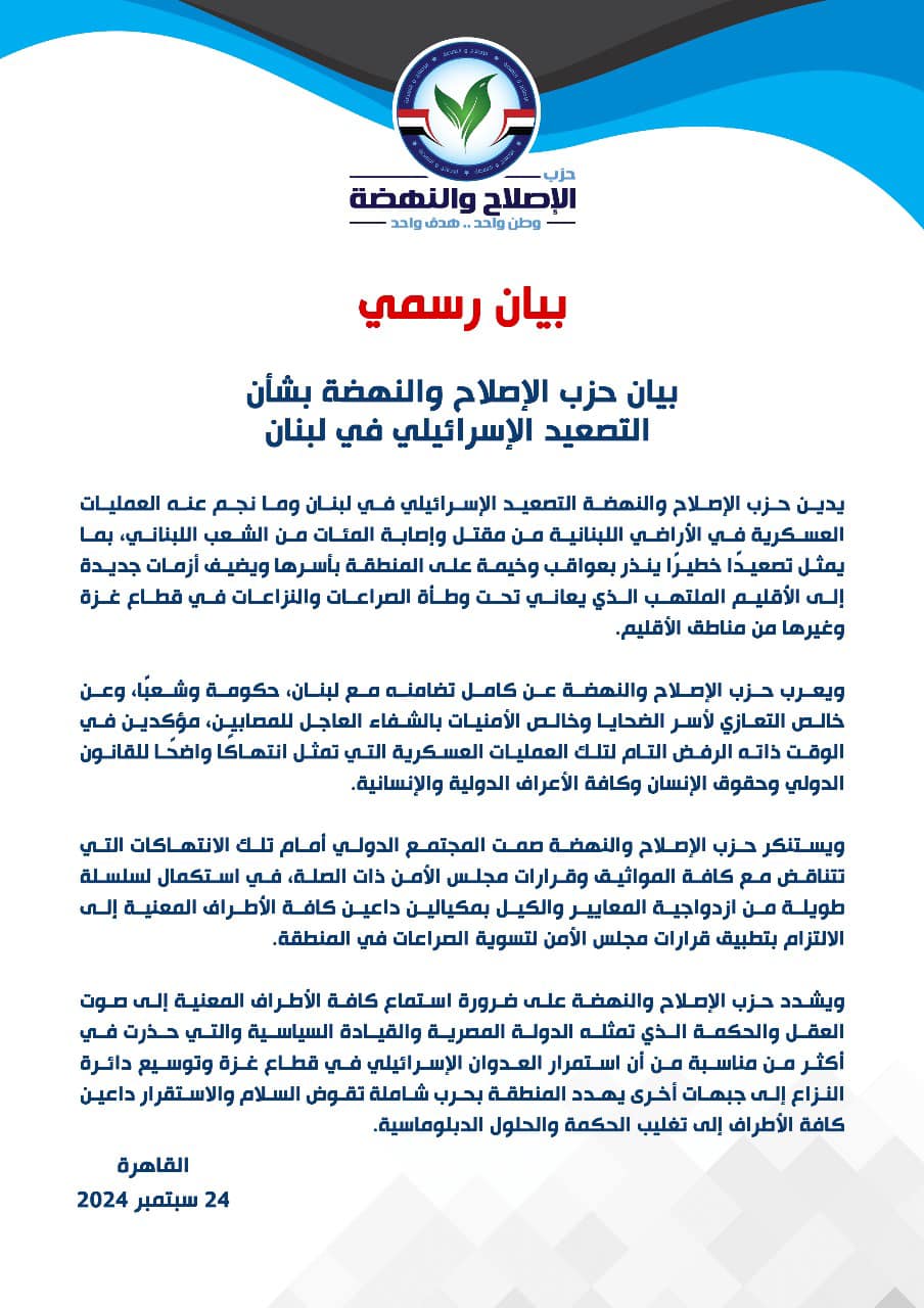ويعرب حزب الإصلاح والنهضة عن كامل تضامنه مع لبنان، حكومة وشعبًا، وعن خالص التعازي لأسر الضحايا وخالص الأمنيات بالشفاء العاجل للمصابين، مؤكدين في الوقت ذاته الرفض التام لتلك العمليات العسكرية التي تمثل انتهاكًا واضحًا للقانون الدولي وحقوق الإنسان وكافة الأعراف الدولية والإنسانية.