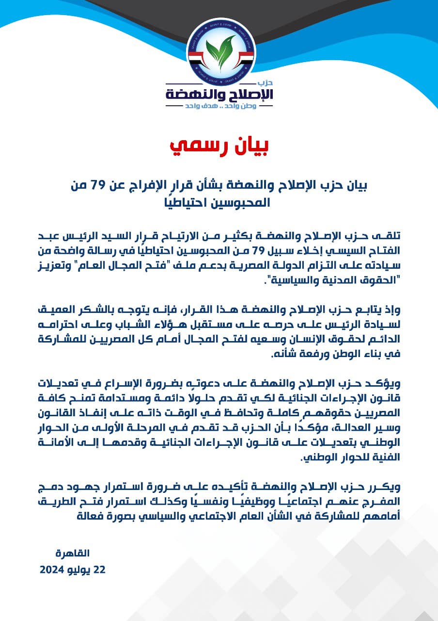 بيان حزب الإصلاح والنهضة بشأن قرار الإفراج عن 79 من المحبوسين احتياطيًا