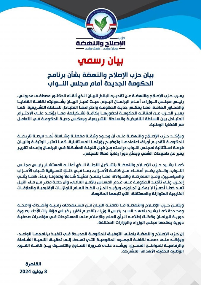 إن حزب الإصلاح والنهضة يتمنى التوفيق للحكومة الجديدة في تنفيذ برنامجها الواعد، ويؤكد على دعمه لكافة الجهود الحكومية التي تهدف إلى تحقيق التنمية الشاملة والرفاهية للمواطن المصري، ويشدد على ضرورة التعاون والتنسيق بين كافة القوى الوطنية لتحقيق الأهداف المشتركة.