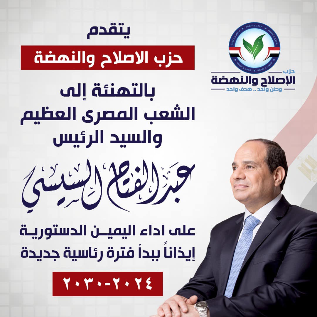 يتقدم حزب الإصلاح والنهضة بالتهنئة إلى الشعب المصري العظيم وفخامة السيد الرئيس عبدالفتاح السيسي على أداء اليمين الدستورية إذانًا ببدأ فترة رئاسية جديدة.