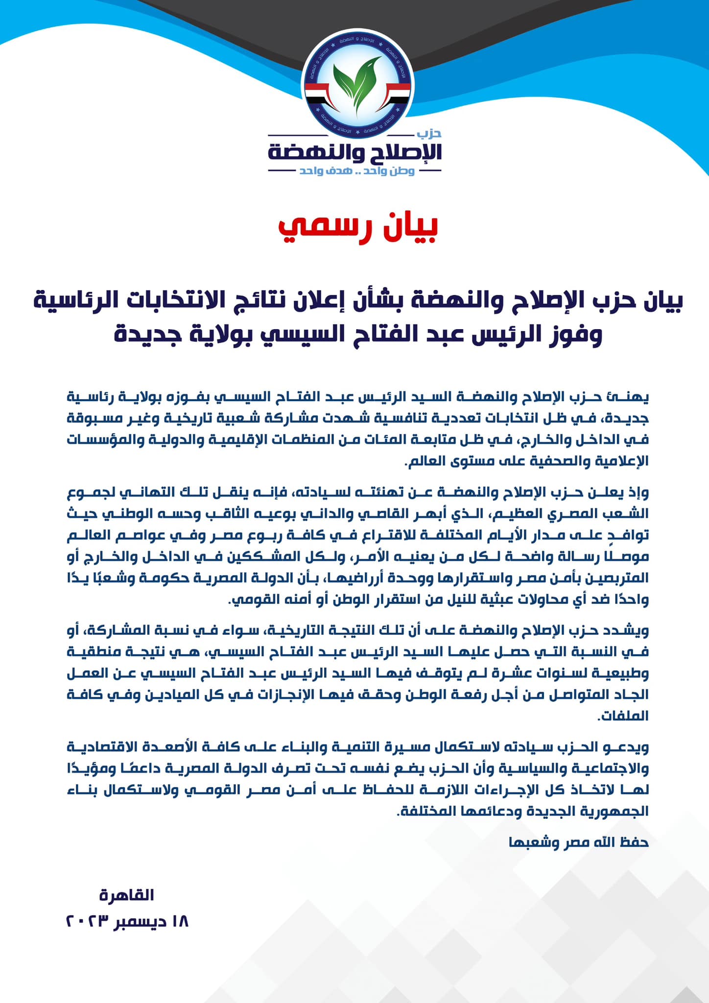 بيان حزب الإصلاح والنهضة بشأن إعلان نتائج الانتخابات الرئاسية وفوز الرئيس عبد الفتاح السيسي بولاية جديدة.