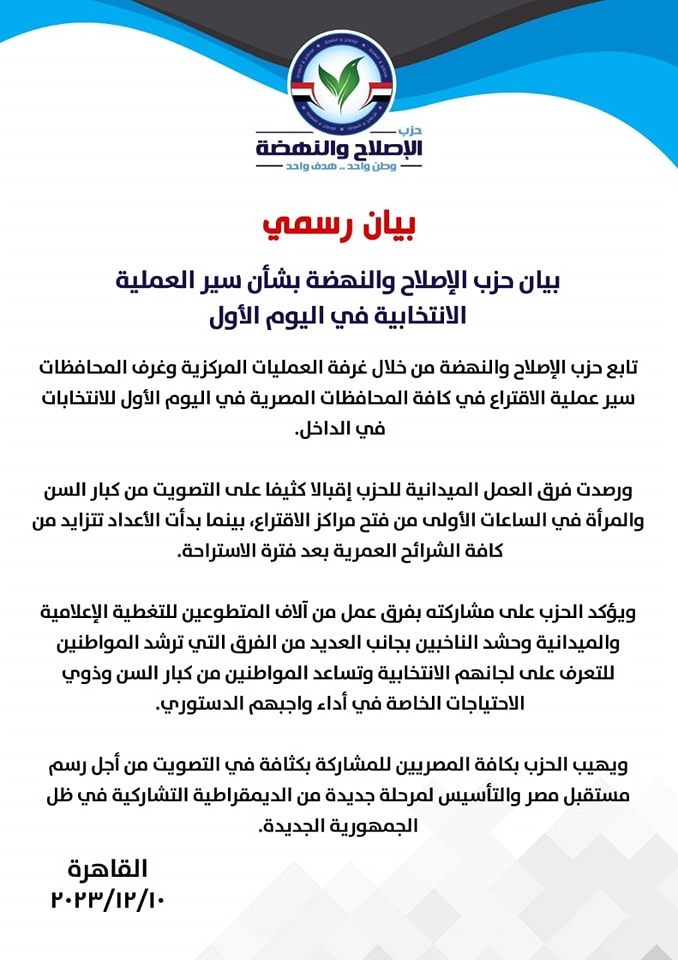 بيان حزب الإصلاح والنهضة بشأن سير العملية الانتخابية في اليوم الأول