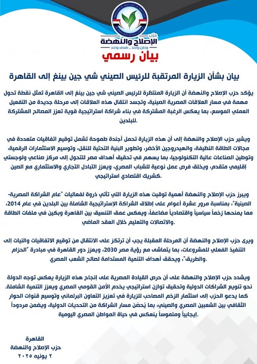 يؤكد حزب الإصلاح والنهضة أن الزيارة المنتظرة للرئيس الصيني شي جين بينغ إلى القاهرة تمثل نقطة تحول مهمة في مسار العلاقات المصرية الصينية، وتجسد انتقال هذه العلاقات إلى مرحلة جديدة من التفعيل العملي الموسع، بما يعكس الرغبة المشتركة في بناء شراكة استراتيجية قوية تعزز المصالح المشتركة للبلدين.