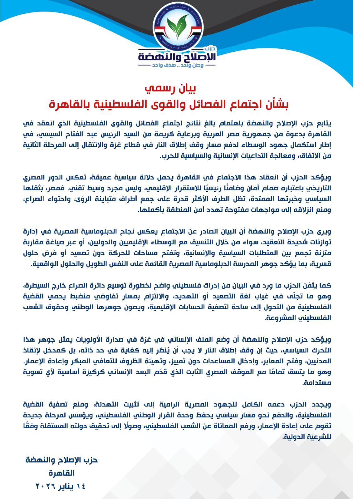 يتابع حزب الإصلاح والنهضة باهتمام بالغ نتائج اجتماع الفصائل والقوى الفلسطينية الذي انعقد في القاهرة بدعوة من جمهورية مصر العربية وبرعاية كريمة من السيد الرئيس عبد الفتاح السيسي، في إطار استكمال جهود الوسطاء لدفع مسار وقف إطلاق النار في قطاع غزة والانتقال إلى المرحلة الثانية من الاتفاق، ومعالجة التداعيات الإنسانية والسياسية للحرب.