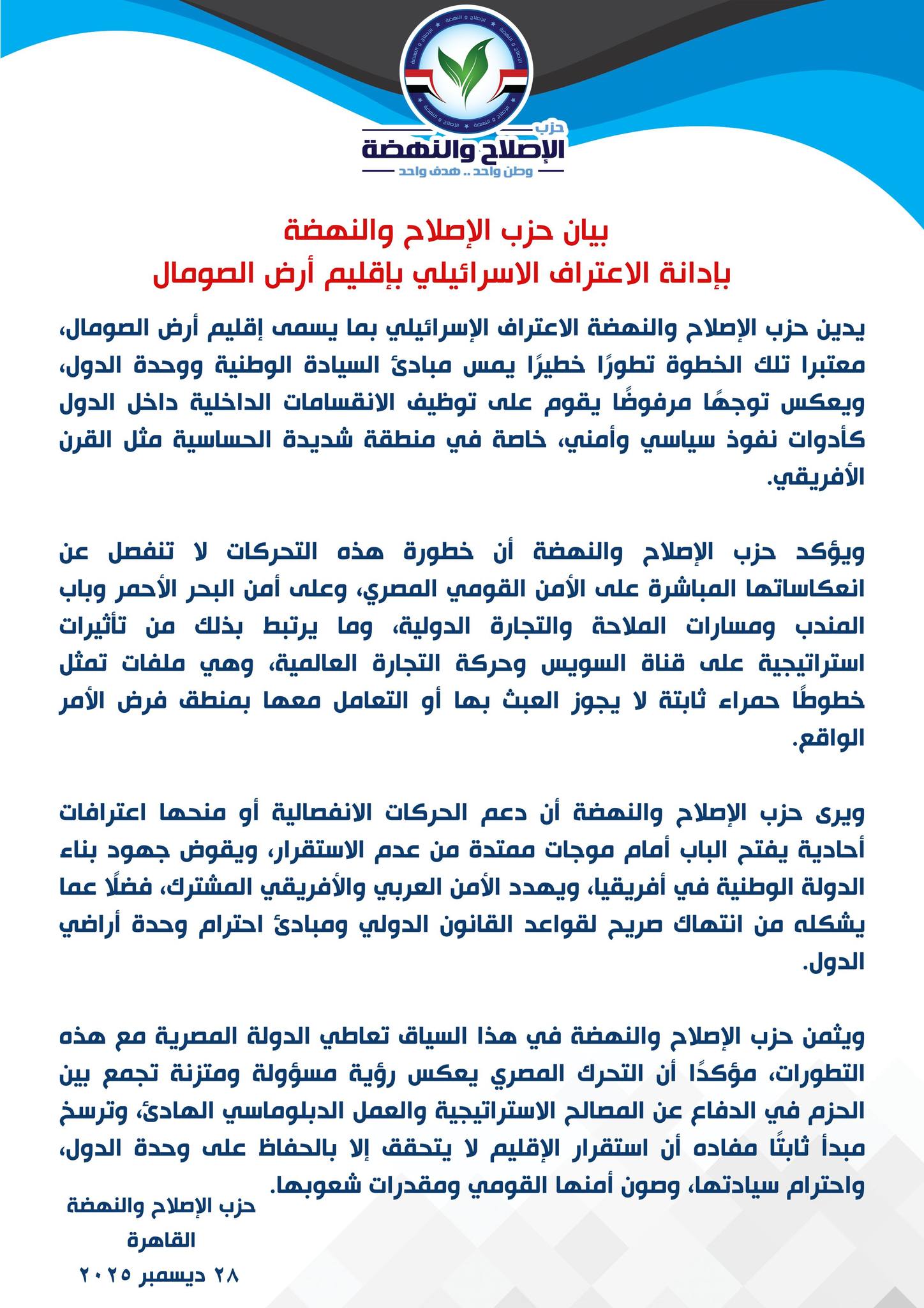 ويؤكد حزب الإصلاح والنهضة أن خطورة هذه التحركات لا تنفصل عن انعكاساتها المباشرة على الأمن القومي المصري، وعلى أمن البحر الأحمر وباب المندب ومسارات الملاحة والتجارة الدولية، وما يرتبط بذلك من تأثيرات استراتيجية على قناة السويس وحركة التجارة العالمية، وهي ملفات تمثل خطوطًا حمراء ثابتة لا يجوز العبث بها أو التعامل معها بمنطق فرض الأمر الواقع.