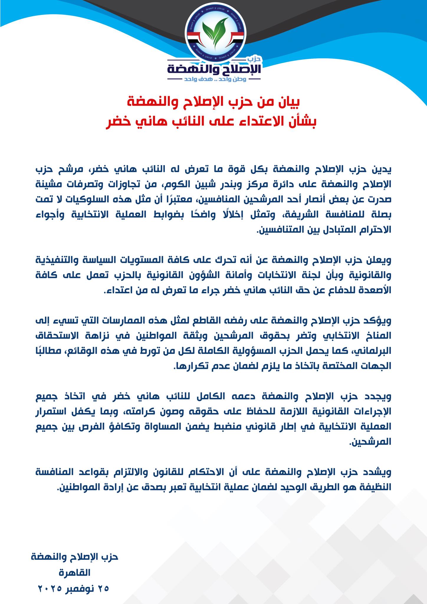 يدين حزب الإصلاح والنهضة بكل قوة ما تعرض له النائب هاني خضر، مرشح حزب الإصلاح والنهضة على دائرة مركز وبندر شبين الكوم، من تجاوزات وتصرفات مشينة صدرت عن بعض أنصار أحد المرشحين المنافسين، معتبرًا أن مثل هذه السلوكيات لا تمت بصلة للمنافسة الشريفة، وتمثل إخلالًا واضحًا بضوابط العملية الانتخابية وأجواء الاحترام المتبادل بين المتنافسين.